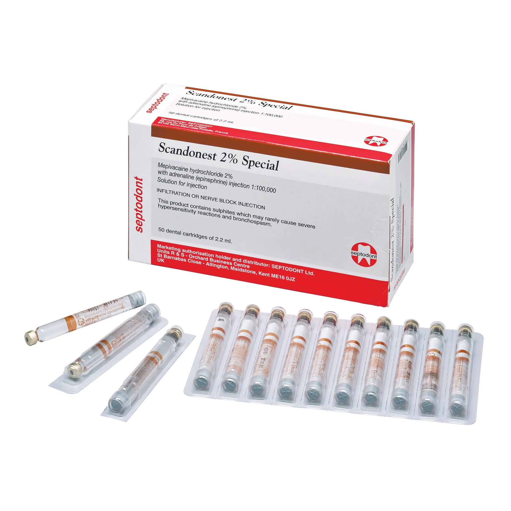 - Caja de cartón con 50 anestésicos (5 Blísters con 10 cartuchos de 1,8ml c.u.)